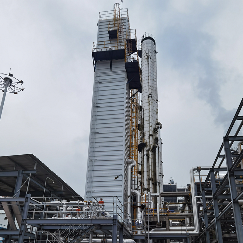 2. 精餾過(guò)程采用雙塔精餾技術(shù),將水分、醇類、烴類、硫化物和不凝氣集中在一個(gè)精餾冷箱內(nèi)集中解決。